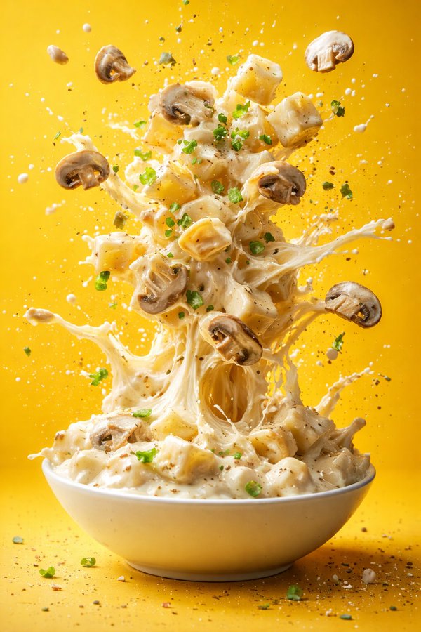 "scene_description": "A creamy pasta dish erupting upward from a white bowl, with cheese stretching and ingredients flying in all directions.",