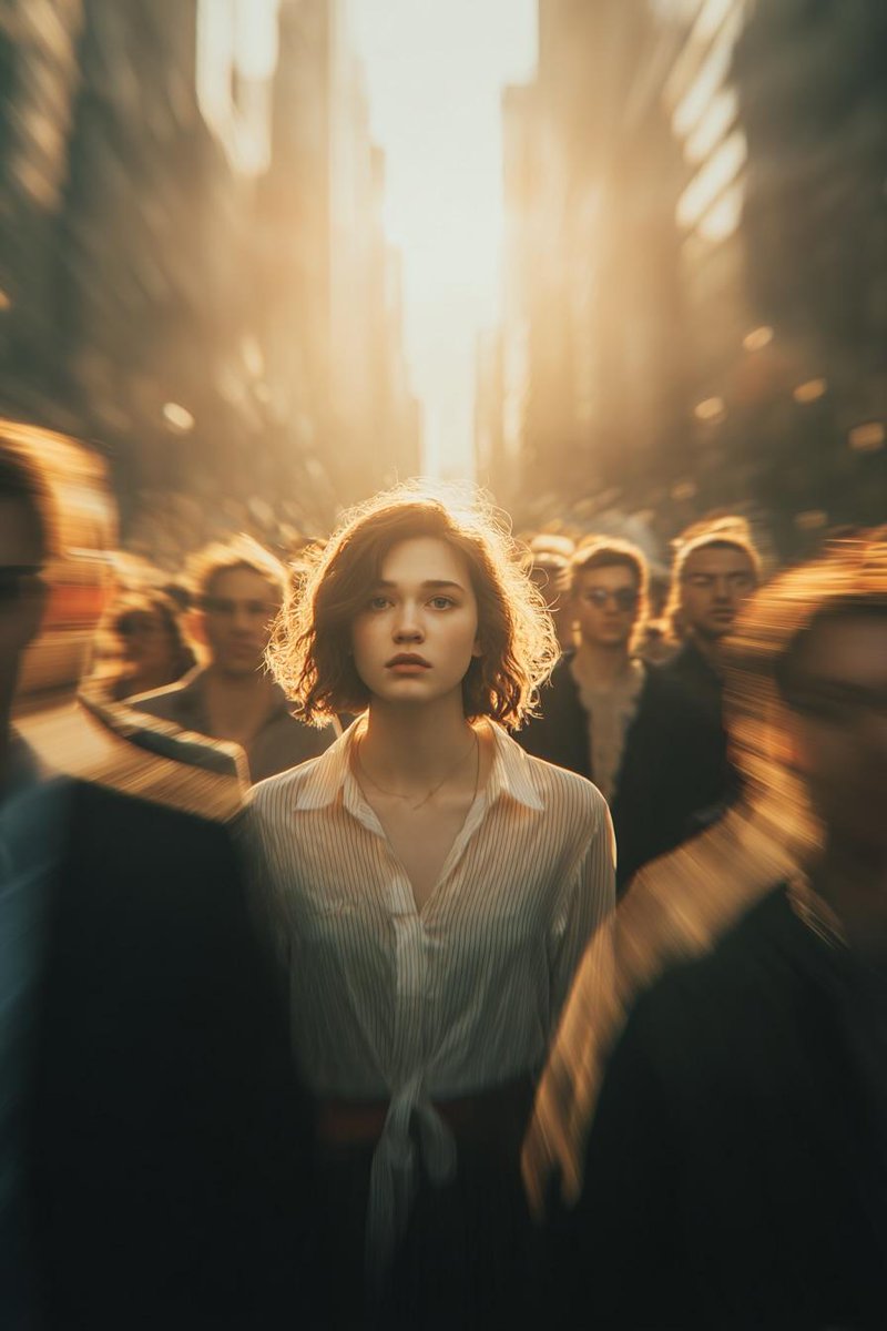 电影概念肖像:一位年轻女性静立于熙攘的都市人群中,极端的径向运动模糊,凝固的身份效果,动态的速度扭曲,身后爆发出强烈的光芒,强烈的中心构图,电影般的画面构图,心理张力,城市中的存在性孤独,情感孤立的叙事,大胆的暖色调,超现实主义,实验性时尚编辑风格。