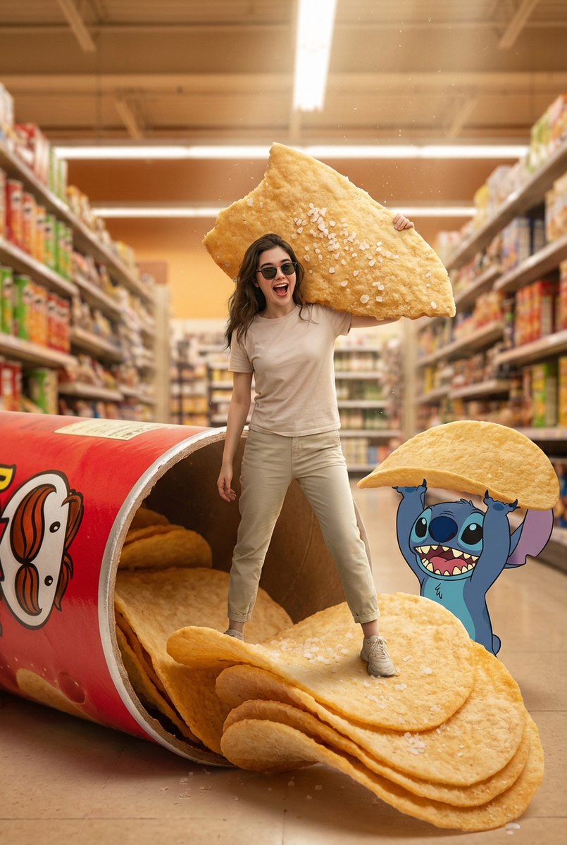一幅超写实、8k、电影级广角镜头从低角度视角捕捉了一个超现实场景,强调了经典品客薯片罐的巨大规模。前景由一个巨大的红色圆柱形品客薯片筒占据,它被翻倒,巨大的、完美的马鞍形薯片正滑落出来。一名男子得意洋洋地站在一块巨大的弯曲薯片边缘,相对于史迪奇来说他看起来是正常体型,但与零食相比却很微小,戴着太阳镜,穿着浅米色T恤和浅卡其色裤子,表情兴奋,张着嘴,上传的面部作为参考。他肩上扛着一块巨大的破碎咸味薯片,具有超写实的纹理。在右边,一个卡通风格、3D渲染的史迪奇(来自《星际宝贝》)咧嘴大笑,大耳朵竖起,头顶抓着一块巨大的、完美无缺的品客薯片,像一把伞。背景揭示了宽敞超市过道的柔和模糊、暖色调的内部,体积光从头顶灯光过滤下来,投下明亮、诱人的光晕。巨大的红色筒身上可见醒目的品客薯片和 Mr. P 标志。场景由柔光箱照明照亮,在主体上创造了微妙的边缘光,增强了它们的三维质感以及淀粉薯片、盐晶体和角色的超精细纹理 2:3r