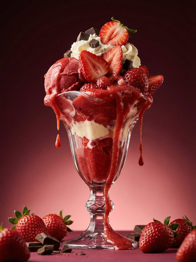 风味主题:【草莓】。超高端甜品广告海报,超写实且极度诱人。画面中央一只高身水晶圣代杯,盛满以风味主题为灵感的浓郁奶油甜品,搭配多个同属该风味与色彩体系、形态/质地/制法明显不同的互补配料;即使风味本身视觉辨识度已高,也仍需呈现清晰可辨的固体装饰元素。冰淇淋球致密、冷冽、奶油感十足,边缘柔软微融。与风味同色的液体飞溅明确源自杯内,从甜品本身向上向外爆发,厚重、光亮、受重力牵引,以不规则丝带与液滴形态缓缓覆盖杯口与内壁。水果或点缀物水润多汁、肉眼可见水分,部分置于前景营造景深。无缝无限延伸的摄影棚背景呈精致中深色调,干净无纹理,柔光照射带微妙渐变,与风味主题色彩匹配。电影级灯光、浅景深、高端商业美学,奢华而优雅,超精细,8K画质。无文字、无标志、无水印、无包装、无边框、无CGI或卡通观感。