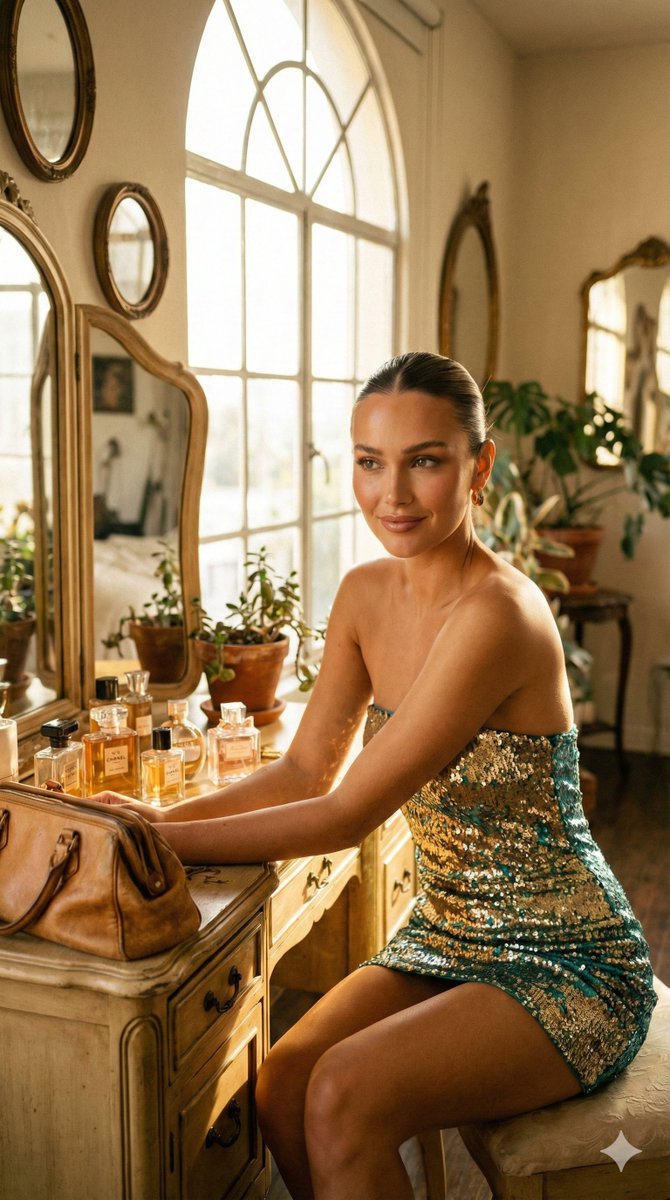 { "prompt": "A stylish young woman seated at a wooden vanity table in a sunlit room, wearing a strapless sequined mini dress with gold and teal accents. Her hair is styled in a sleek bun, and she poses elegantly with a soft, confident smile. On the vanity are luxury perfume bottles and a tan leather handbag. The scene is bathed in natural daylight from a large window, creating warm highlights and soft shadows with a refined fashion editorial aesthetic.", "style": "photorealistic", "lighting": "natural window light, warm tones", "composition": "three-quarter body, side profile, eye-level", "mood": "elegant, glamorous, intimate", "camera": { "lens": "50mm", "aperture": "f/2.4", "depth_of_field": "shallow" }, "quality": "high detail, realistic textures, editorial photography", "aspect_ratio": "2:3" }{ "prompt": "一位时尚的年轻女性,坐在阳光充足的房间里一张木质梳妆台前,身穿一件带有金色和青色点缀的无肩带亮片迷你连衣裙。她的头发梳成光滑的发髻,姿态优雅,带着柔和而自信的微笑。梳妆台上摆放着奢华的香水瓶和一个棕褐色皮包。场景沐浴在从大窗户射入的自然日光中,营造出温暖的高光和柔和的阴影,呈现出精致的时尚杂志美学。", "style": "写实", "lighting": "自然窗光,暖色调", "composition": "四分之三身长,侧面,平视", "mood": "优雅,迷人,亲密", "camera": { "lens": "50mm", "aperture": "f/2.4", "depth_of_field": "浅景深" }, "quality": "高细节,逼真纹理,编辑摄影", "aspect_ratio": "2:3" }