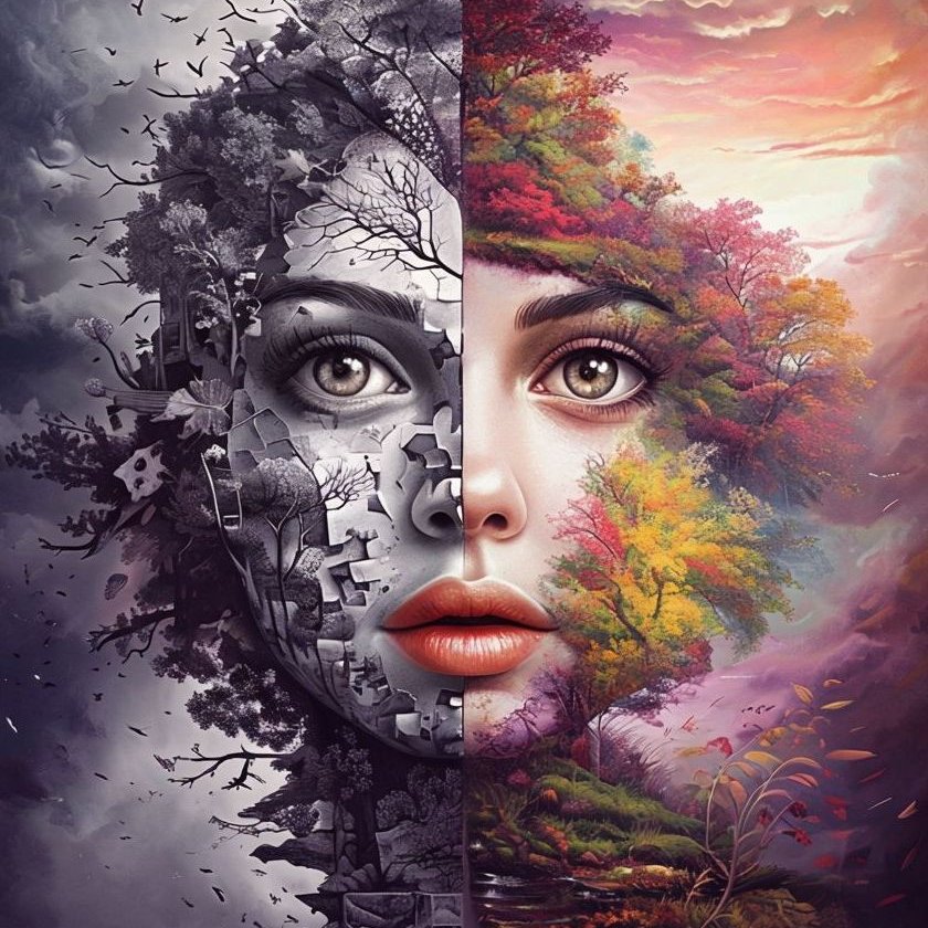 右侧:鲜艳、多彩、梦幻自然——繁茂的秋树从面部生长而出、温暖阳光、柔和粉彩天空、飘浮落叶、生命与和谐。