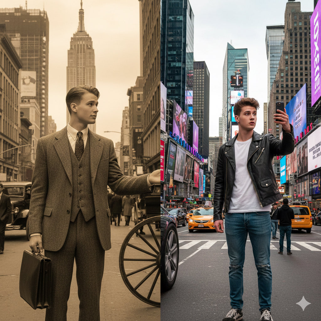 <span>A realistic split-screen cinematic shot of </span><span class="bg-blue-200 text-blue-800 px-1.5 py-[1px] border border-black font-bold">Scene</span><span>, showing the same </span><span class="bg-blue-200 text-blue-800 px-1.5 py-[1px] border border-black font-bold">Gender</span><span> appearing in two different eras: </span><span class="bg-blue-200 text-blue-800 px-1.5 py-[1px] border border-black font-bold">Era_A</span><span> on the left and </span><span class="bg-blue-200 text-blue-800 px-1.5 py-[1px] border border-black font-bold">Era_B</span><span> on the right. If a reference image is uploaded, match her or his exact face, including facial features, hairstyle, hair accessories, skin tone, and body shape. Left side (</span><span class="bg-blue-200 text-blue-800 px-1.5 py-[1px] border border-black font-bold">Era_A</span><span>): The </span><span class="bg-blue-200 text-blue-800 px-1.5 py-[1px] border border-black font-bold">Gender</span><span> appears fully visible (face + upper body). She or his wears clothing, hairstyle, and accessories authentic to </span><span class="bg-blue-200 text-blue-800 px-1.5 py-[1px] border border-black font-bold">Era_A</span><span>, fitting the historical setting. Environment, architecture, materials, vehicles, props and lighting must all belong to </span><span class="bg-blue-200 text-blue-800 px-1.5 py-[1px] border border-black font-bold">Era_A</span><span>. Atmosphere feels nostalgic and historically accurate. Right side (</span><span class="bg-blue-200 text-blue-800 px-1.5 py-[1px] border border-black font-bold">Era_B</span><span>): The same </span><span class="bg-blue-200 text-blue-800 px-1.5 py-[1px] border border-black font-bold">Gender</span><span> (same age, same face, same body proportions) appears fully visible (face + upper body) in </span><span class="bg-blue-200 text-blue-800 px-1.5 py-[1px] border border-black font-bold">Era_B</span><span>. She or he wears contemporary or era-appropriate fashion from </span><span class="bg-blue-200 text-blue-800 px-1.5 py-[1px] border border-black font-bold">Era_B</span><span>, with matching modern props, technology, surroundings, and lighting. Center area: The two eras merge organically, with no hard dividing line. Architectural elements, clothing textures, and props subtly transition from old to new. The {Gender} in each era may glance toward the other side, creating a sense of time-travel and self-encounter. Photorealistic, cinematic lighting, ultra-detailed textures, high realism, 8k quality. Aspect Ratio: </span><span class="bg-blue-200 text-blue-800 px-1.5 py-[1px] border border-black font-bold">Aspect_Ratio</span><span> --- Scene: </span><span class="bg-blue-200 text-blue-800 px-1.5 py-[1px] border border-black font-bold">NewYork street</span><span> Gender:</span><span class="bg-blue-200 text-blue-800 px-1.5 py-[1px] border border-black font-bold">Girl</span><span> Era_A: </span><span class="bg-blue-200 text-blue-800 px-1.5 py-[1px] border border-black font-bold">1930s Empire State Building</span><span> Era_B: </span><span class="bg-blue-200 text-blue-800 px-1.5 py-[1px] border border-black font-bold">Modern Times Square</span><span> Aspect_Ratio: </span><span class="bg-blue-200 text-blue-800 px-1.5 py-[1px] border border-black font-bold">4:7</span>