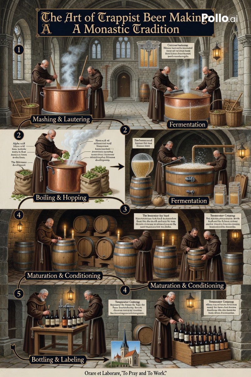 Generate a hight quality infographic explaining beer making in a Trapist Abbay with rich illustrations.