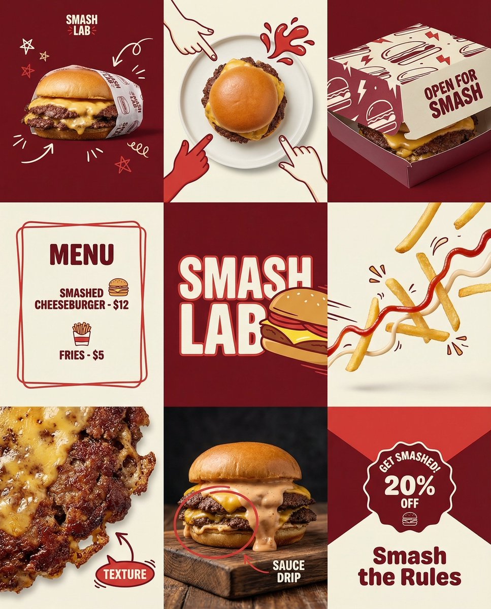 Create a visually cohesive 3x3 Instagram campaign grid concept for a modern food brand.