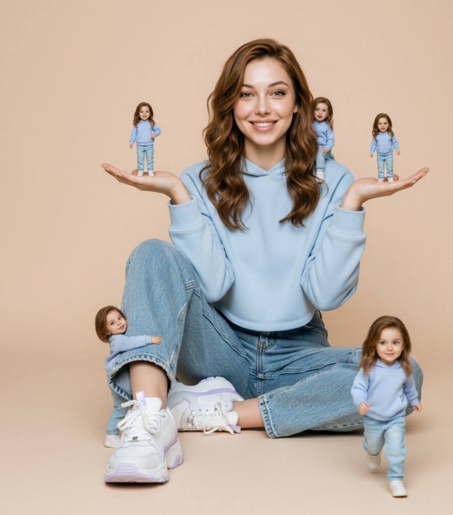 Use my uploaded photo as the main and only face reference. My face must remain exactly the same — do NOT change facial features, expression, eye shape, nose, lips, skin tone, age, or identity. No face swap, no beautification, no stylization on the face. Create an ultra-realistic studio portrait using a miniature clone concept: Main person: Sitting on the floor, centered in frame, relaxed pose, calm and confident mood. Facial expression must match the reference exactly. Miniature clones (same face, same identity): Gemini • Two miniatures standing on my open palms (palms facing upward) • One miniature sitting on my right shoulder • One miniature pushing my right shoe • One miniature running in the foreground toward the camera (sense of motion but still sharp and realistic) • One miniature hugging my left knee from behind All miniatures must have the exact same face, expression, and identity as the main person.