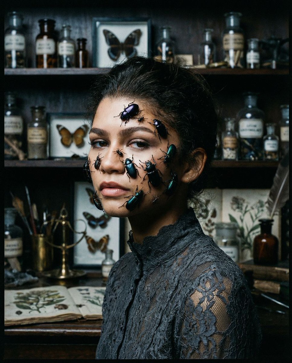 { "vibe_title_en": "Entomological Elegance", "master_prompt": "A hyper-realistic, macro-cinematic portrait of The Protagonist situated in a chaotic, dust-laden Victorian Entomology Workshop. The subject's face is artfully partially obscured by a swarm of hyper-detailed, jewel-toned obsidian arachnids and beetles, crawling delicately across the skin texture, mimicking a living veil. The environment is incredibly busy and claustrophobic, packed with shelves of antique apothecary jars, pinned butterfly specimens, scattered brass tools, decaying botanical manuscripts, and overflowing wooden drawers. The lighting is dramatic Chiaroscuro, utilizing a single cold key light to catch the gloss on the insects' carapaces and the natural oils of the subject's skin, while the background clutter fades into deep, textured shadows. Shot on a Phase One XF IQ4 150MP with a 120mm Macro lens for microscopic fidelity, rendered with the gritty, organic grain of pushed Kodak Tri-X 400 film stock. No neon, just dust, shadow, and organic texture.", "meta": { "intent": "Editorial Fashion / Surrealist Portrait", "priorities": "Texture Fidelity, Surreal Realism, Atmospheric Density", "device_profile": "Phase One XF IQ4 150MP" }, "frame": { "aspect": "4:5", "composition": "Extreme Close-Up (Macro Focus)", "layout": "Centralized Subject with Dense Peripheral Clutter", "camera_angle": "Eye-Level", "tilt_roll_degrees": "0°" }, "subject": { "gender": "Female", "identity": "The Protagonist", "demographics": "Young Adult, racially ambiguous", "face": "Flawless skin texture visible beneath the surreal insect overlay, sharp cheekbones", "hair": "Slicked back or pulled away to focus on the face and insects", "body": "Shoulders visible, tension in the neck muscles", "expression": "Stoic, intense, unblinking gaze directly into the lens", "pose": "Static, frozen in a moment of symbiosis with the creatures" }, "wardrobe_accessories": { "garments": [ { "item": "High-collar blouse", "material": "Antique Lace / Silk", "color": "Charcoal or Deep Black", "fit": "Tight, Victorian silhouette" } ], "accessories": [] }, "environment": { "setting": "Victorian Entomology Workshop / Taxidermy Lab", "surfaces": "Aged wood, glass jars, brass metal, dust particles", "depth": "Shallow depth of field, background is a blur of clutter", "atmosphere": "Stagnant air, smell of old paper and preservative fluids, dusty", "lens_interaction": "Sharp focus on the eyes and insects, heavy bokeh on background shelves" }, "lighting": { "key": "Hard, cold directional light (Moonlight or Laboratory Lamp)", "fill": "Negative fill (deep shadows)", "rim": "Subtle edge light on the insects", "shadows": "Crushed blacks, high contrast", "color_temperature": "Cool / Desaturated (5500K)", "sensor_fla{ "vibe_title_en": "昆虫学雅致", "master_prompt": "一幅超现实、电影级微距特写肖像,描绘了主人公置身于一个混乱、尘土飞扬的维多利亚时代昆虫学工作室。主人公的脸部被一群超精细、宝石色调的黑曜石蜘蛛和甲虫巧妙地部分遮挡,它们在皮肤纹理上精致地爬行,仿佛一层活生生的面纱。环境极其繁忙和幽闭,堆满了古董药剂罐的架子、钉着的蝴蝶标本、散落的黄铜工具、腐朽的植物学手稿以及溢出的木制抽屉。灯光采用戏剧性的明暗对比,利用一束冷色主光捕捉昆虫甲壳的光泽和主人公皮肤的天然油脂,而背景的杂物则逐渐融入深邃、有质感的阴影中。使用 Phase One XF IQ4 150MP 相机和 120mm 微距镜头拍摄,以实现微观细节的逼真度,并以推冲的 Kodak Tri-X 400 胶片颗粒感呈现出粗犷、有机的质感。没有霓虹灯,只有灰尘、阴影和有机纹理。", "meta": { "intent": "时尚编辑 / 超现实主义肖像", "priorities": "纹理逼真度、超现实主义、氛围密度", "device_profile": "Phase One XF IQ4 150MP" }, "frame": { "aspect": "4:5", "composition": "特写(微距对焦)", "layout": "主体居中,周围杂物密集", "camera_angle": "平视", "tilt_roll_degrees": "0°" }, "subject": { "gender": "女性", "identity": "主人公", "demographics": "青年,种族模糊", "face": "超现实昆虫覆盖下可见无瑕的皮肤纹理,颧骨分明", "hair": "向后梳或扎起,以突出脸部和昆虫", "body": "可见肩膀,颈部肌肉紧绷", "expression": "坚忍、专注、目不转睛地直视镜头", "pose": "静止,凝固在与生物共生的一刻" }, "wardrobe_accessories": { "garments": [ { "item": "高领衬衫", "material": "古董蕾丝 / 丝绸", "color": "炭灰色或深黑色", "fit": "紧身,维多利亚时代轮廓" } ], "accessories": [] }, "environment": { "setting": "维多利亚时代昆虫学工作室 / 动物标本制作实验室", "surfaces": "老旧木材、玻璃罐、黄铜金属、灰尘颗粒", "depth": "浅景深,背景是模糊的杂物", "atmosphere": "停滞的空气,旧纸张和防腐液的气味,布满灰尘", "lens_interaction": "眼睛和昆虫清晰对焦,背景架子有明显的焦外虚化" }, "lighting": { "key": "硬朗、冷色调定向光(月光或实验室灯)", "fill": "负补光(深阴影)", "rim": "昆虫边缘的细微轮廓光", "shadows": "压暗的黑色,高对比度", "color_temperature": "冷色调 / 去饱和(5500K)", "sensor_fla": "" } }