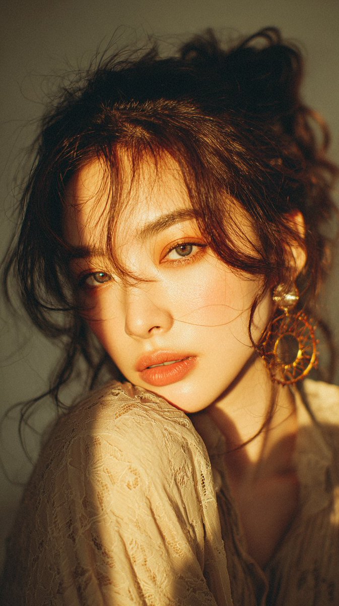 电影质感的特写肖像,描绘了一位处于温暖黄金时刻光线中的年轻女子,凌乱的深赤褐色头发随意盘起,柔软的鬓发修饰着她的脸庞,身穿一件呈柔和米色、带有精致花卉图案和半透明质感的飘逸复古蕾丝衬衫,沐浴在一束戏剧性的阳光中,阳光斜穿过她的肩膀和脖子,在明亮的暖色调高光和深沉的柔和阴影之间产生高对比度,一只耳朵上戴着由金色金属和琥珀玻璃珠制成的大而复杂的波西米亚大圆耳环,捕捉着光线,背景在中性泥土色调中柔和模糊,情绪唤起怀旧和安静的亲密感,用 35 毫米胶片拍摄,带有可见的细微颗粒,浅景深,偏向棕褐色的丰富暖色调色,微妙的镜头光晕和柔焦边缘,蕾丝面料、发丝和珠宝中的超精细纹理,4k 分辨率,时尚杂志摄影风格。