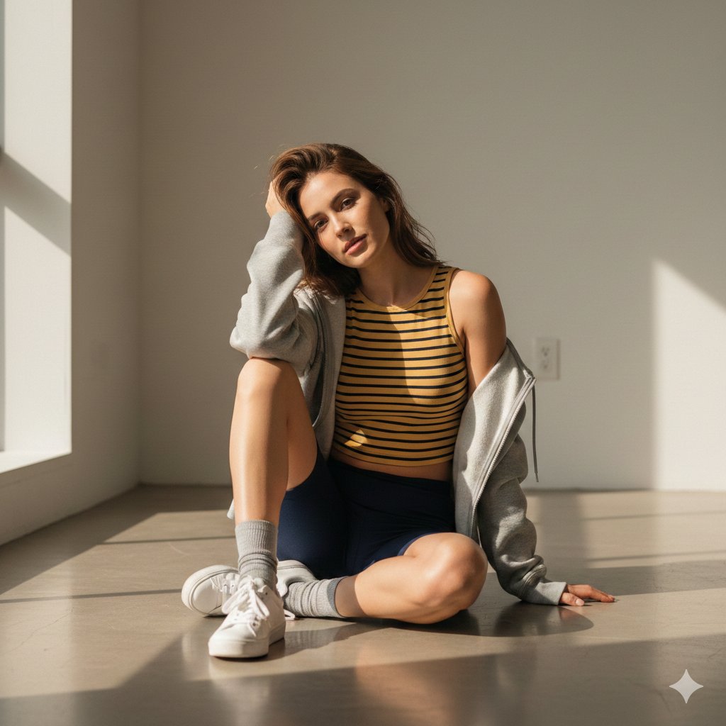 生成图片,超高清 8K 竖版肖像,EOS 风格摄影。保持原始面部完全不变——不要改变或增强任何面部特征。 一张柔和自然光下的女性肖像(面部、眼睛、鼻子、嘴巴和发型与照片保持一致,我的脸与参考图片 100% 相同),她随意地坐在明亮、简约的工作室地板上。 她穿着一件黄黑条纹露脐上衣,一件浅灰色连帽衫微微滑落一边肩膀,搭配海军蓝骑行短裤、灰色袜子和白色运动鞋。 她的坐姿放松而舒适——一只膝盖弯曲靠近胸部,另一条腿稍微向前伸展。 她一只手随意地搭在膝盖上,另一只手放在地板上以保持平衡,眼神柔和地望向镜头,表情平静而安详。 阳光透过附近的窗户洒进来,在她脸上形成柔和的高光,在地板上投下淡淡的阴影,增添了温暖和自然的深度。 她的妆容清淡自然,突显了她真实的五官。 她略显凌乱的头发在阳光下闪耀,营造出清新、舒适的感觉。 背景干净、中性、整洁——强调简约和宁静。 氛围与风格: 柔和的日光,暖色调,韩式生活美学,舒适的写实主义,现代极简主义。 电影级 EOS 镜头清晰度,无颗粒感,无模糊,真实色彩和阴影。 8K 超细节画质,9:16 肖像构图,自然光深度。 整体氛围:平静、舒适、毫不费力的美丽——一幅在温暖阳光下的宁静生活肖像。
