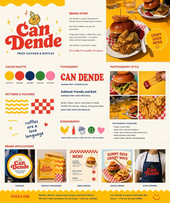 Create a brand guide line document, and detailed info about how to visually represent this restaurant. its name should be “Can Dende”, colorful, whimsical, but traditional, ruffles is a table stake, vibrant yellow, checker red/white and just super clean and fresh foods. Make me smile