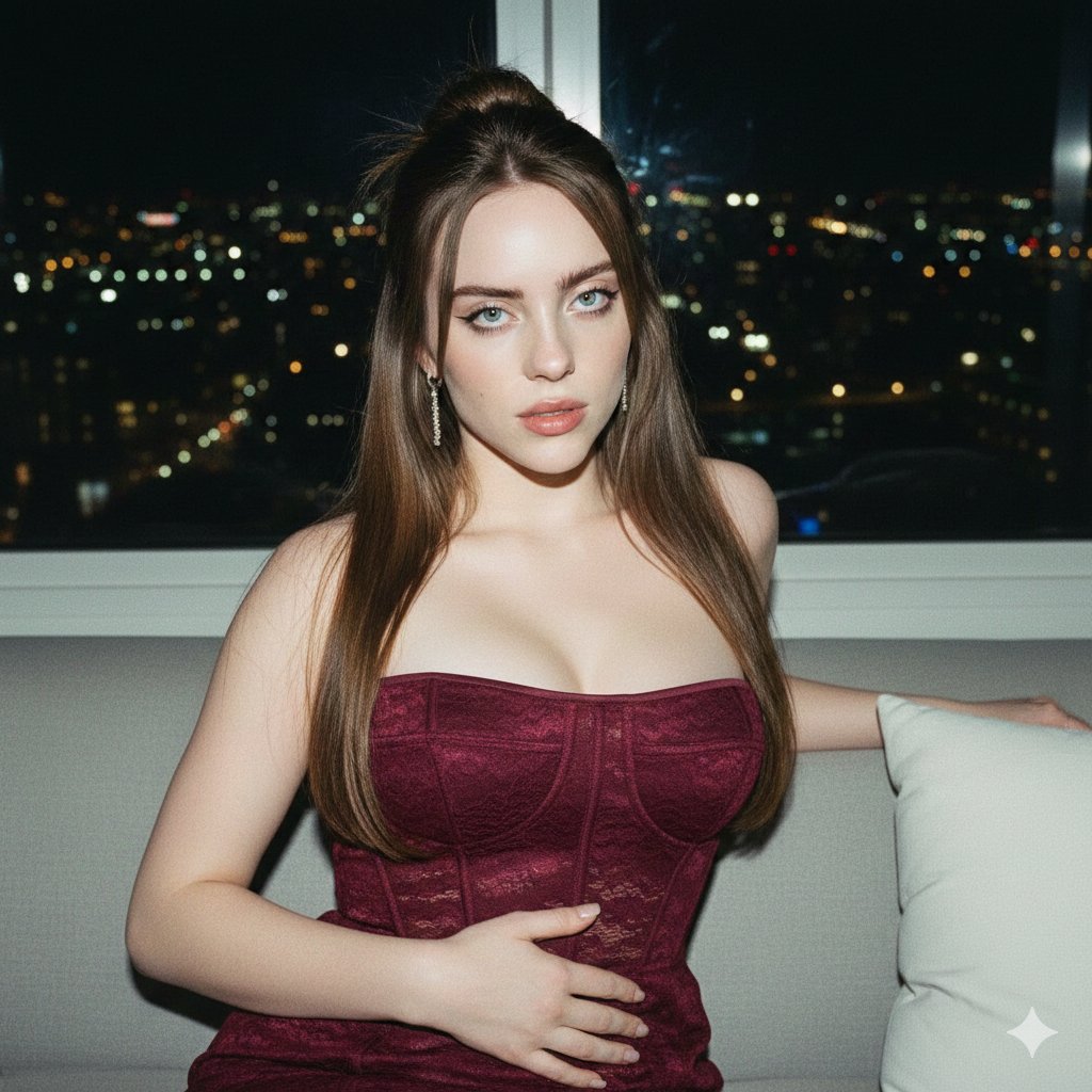 { "image": { "type": "photograph", "style": { "era_inspiration": "Late 1990s / Year 2000", "aesthetic": [ "Dreamy", "Grainy", "Flash photography", "90s editorial look" ], "image_quality": { "grain": "Visible film grain", "flash": "Direct on-camera flash", "finish": "Soft yet high-contrast" } }, "subject": { "identity": { "name": "uk model" "facial_features": "Unchanged, exact likeness preserved" }, "framing": { "shot_type": "Close-up", "camera_angle": "Eye-level", "gaze": "Looking directly into the camera" }, "expression": { "mood": "Serious yet sensual" }, "appearance": { "complexion": { "tone": "Fair / white", "finish": "Flawless, naturally radiant, flash-illuminated" }, "hair": { "color": "Medium brown", "length": "Very long", "style": "Pulled back into a loose bun", "details": "A few loose strands framing the face", "constraints": "Hair must remain exactly as described" }, "makeup": { "eyebrows": "Full", "eyes": "Winged eyeliner", "lips": "Light pink lipstick" }, "jewelry": { "earrings": { "type": "Small dangling earrings", "material": "Silver" } } }, "wardrobe": { "dress": { "type": "Short, strapless dress", "color": "Dark burgundy", "bodice": { "design": "Corset-style", "material": "Textured lace", "opacity": "Not see-through" }, "skirt": { "material": "Textured lace" } } }, "pose": { "seating": "Sitting on a light gray sofa", "right_hand": "Placed on stomach", "left_arm": "Resting along the back of the sofa" } }, "environment": { "location": { "setting": "High-rise apartment", "time": "Night" }{ "image": { "type": "照片", "style": { "era_inspiration": "1990 年代末 / 2000 年", "aesthetic": [ "梦幻", "颗粒感", "闪光灯摄影", "90 年代杂志风格" ], "image_quality": { "grain": "可见的胶片颗粒", "flash": "机顶直闪", "finish": "柔和却高对比度" } }, "subject": { "identity": { "name": "英国模特", "facial_features": "保持不变,面貌完全一致" }, "framing": { "shot_type": "特写", "camera_angle": "平视", "gaze": "直视镜头" }, "expression": { "mood": "严肃而性感" }, "appearance": { "complexion": { "tone": "白皙", "finish": "无瑕,自然光泽,闪光灯照明" }, "hair": { "color": "中棕色", "length": "非常长", "style": "向后梳成一个松散的发髻", "details": "几缕松散的发丝垂在脸旁", "constraints": "发型必须与描述完全一致" }, "makeup": { "eyebrows": "浓密", "eyes": "上扬眼线", "lips": "淡粉色口红" }, "jewelry": { "earrings": { "type": "小巧的垂坠耳环", "material": "银色" } } }, "wardrobe": { "dress": { "type": "短款无肩带连衣裙", "color": "深色 {argument name=\"dress color\" default=\"勃艮第红\"}", "bodice": { "design": "束身衣式", "material": "纹理蕾丝", "opacity": "不透视" }, "skirt": { "material": "纹理蕾丝" } } }, "pose": { "seating": "坐在浅灰色沙发上", "right_hand": "放在腹部", "left_arm": "搭在沙发靠背上" } }, "environment": { "location": { "setting": "高层公寓", "time": "夜晚" } } } }