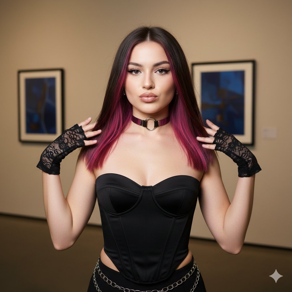 { "prompt_structure": { "subject": { "demographics": "Young woman, light skin tone", "hair": "Straight dark brown hair with electric fuchsia face - framing highlights", "expression": "Relaxed pout with confident eyes", "pose": "Standing facing forward, hands lifting hair outward near shoulders" }, "outfit": { "top": "Black corset - style strapless top with structured boning", "accessories": [ "Black lace fingerless gloves", "Chrome choker necklace", "Silver hip chain" ] }, "makeup": { "eyes": "Defined lashes, bold eyeliner", "lips": "High - shine nude - pink gloss" }, "environment": { "location": "Indoor exhibition space", "background": "Beige wall with framed dark - blue artwork" }, "lighting_and_style": { "aesthetic": "2000s digital cam, influencer flash aesthetic", "lighting": "Direct flash with reflective highlights", "quality": "Clean focus, candid snapshot realism" } } }{ "prompt_structure": { "subject": { "demographics": "年轻女性,浅肤色", "hair": "直的深棕色头发,带有电光 {argument name=\"highlight color\" default=\"fuchsia\"} 脸部修饰挑染", "expression": "放松的嘟嘴,自信的眼神", "pose": "正面站立,双手向外抬起头发至肩膀附近" }, "outfit": { "top": "黑色束身胸衣式无肩带上衣,带结构性鱼骨", "accessories": [ "黑色蕾丝无指手套", "镀铬项圈", "银色腰链" ] }, "makeup": { "eyes": "清晰的睫毛,大胆的眼线", "lips": "高光裸粉色唇彩" }, "environment": { "location": "室内展览空间", "background": "米色墙壁,挂有带框的深蓝色艺术品" }, "lighting_and_style": { "aesthetic": "2000 年代数码相机,网红闪光灯美学", "lighting": "直射闪光灯,带反射高光", "quality": "清晰对焦,抓拍写实感" } } }