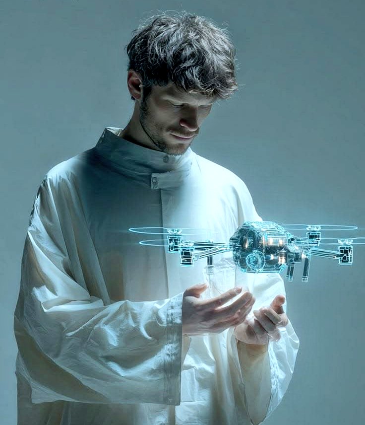 european man in his mid 20s, wearing a loose fitting white technical protective lab coat made of smooth light fabric, holding a transparent hologram of a drone rendered with sharp lines and detailed mechanical parts hovering in mid air, with focus on his hands and arms and the hovering drone in the middle ground, set against a soft gray neutral background with subtle cool lighting, high contrast illumination emphasizing the subject and the drone, shot with a Canon EOS R5, 85mm f/1.2 lens, futuristic realistic aesthetic with high detail and crisp tones in 8k
