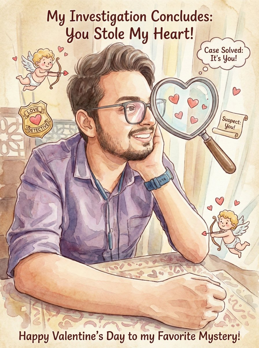 请先让我上传一张图片。然后,将这张图片制作成一张风趣、可爱、独一无二的情人节贺卡。将照片中的人物融入一张富有创意、风格化、梦幻般的水彩贺卡中。