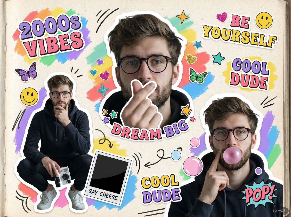 背景看起来像一本打开的素描本,带有纹理纸张,填满了彩虹色调的彩色笔触、俏皮涂鸦、箭头、星星、爱心、蝴蝶、笑脸和波普艺术贴纸。大胆、泡泡感的贴纸字母写着“2000s Vibes”、“Dream Big”、“Be Yourself”、“Cool Dude”、“Say Cheese”和“Pop!”。