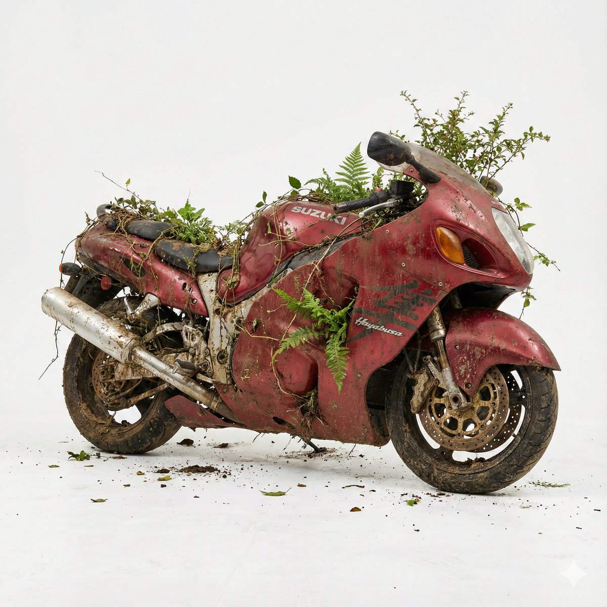 纯白背景下植被缠绕的废弃锈蚀物