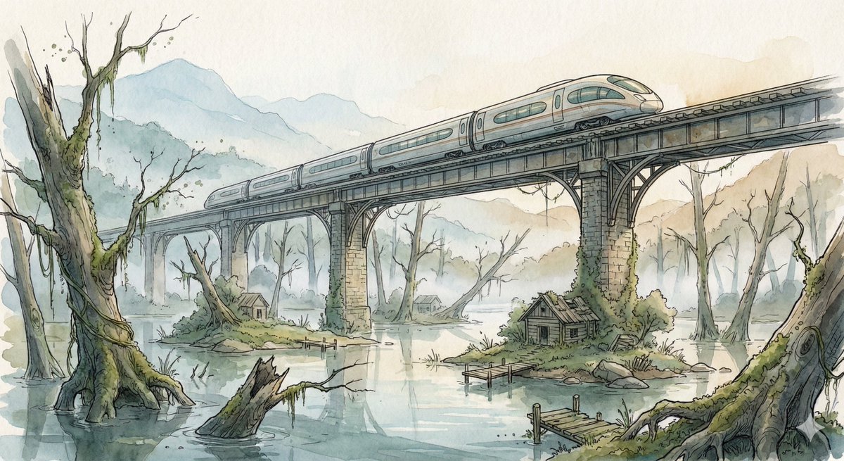 幻境水彩:穿行水淹密林的列车
