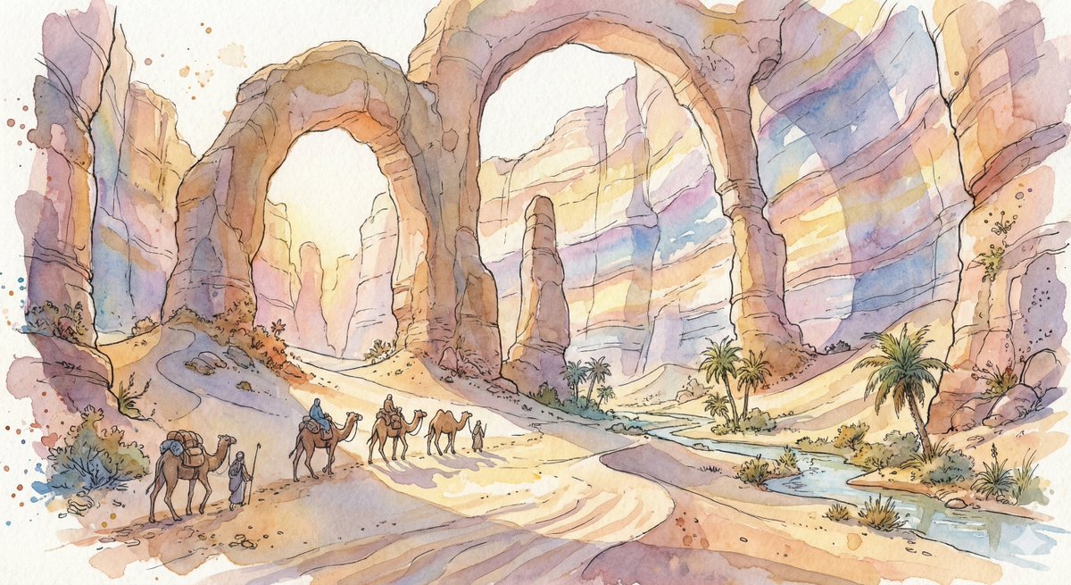 巨石峡谷绿洲的奇幻水彩商旅