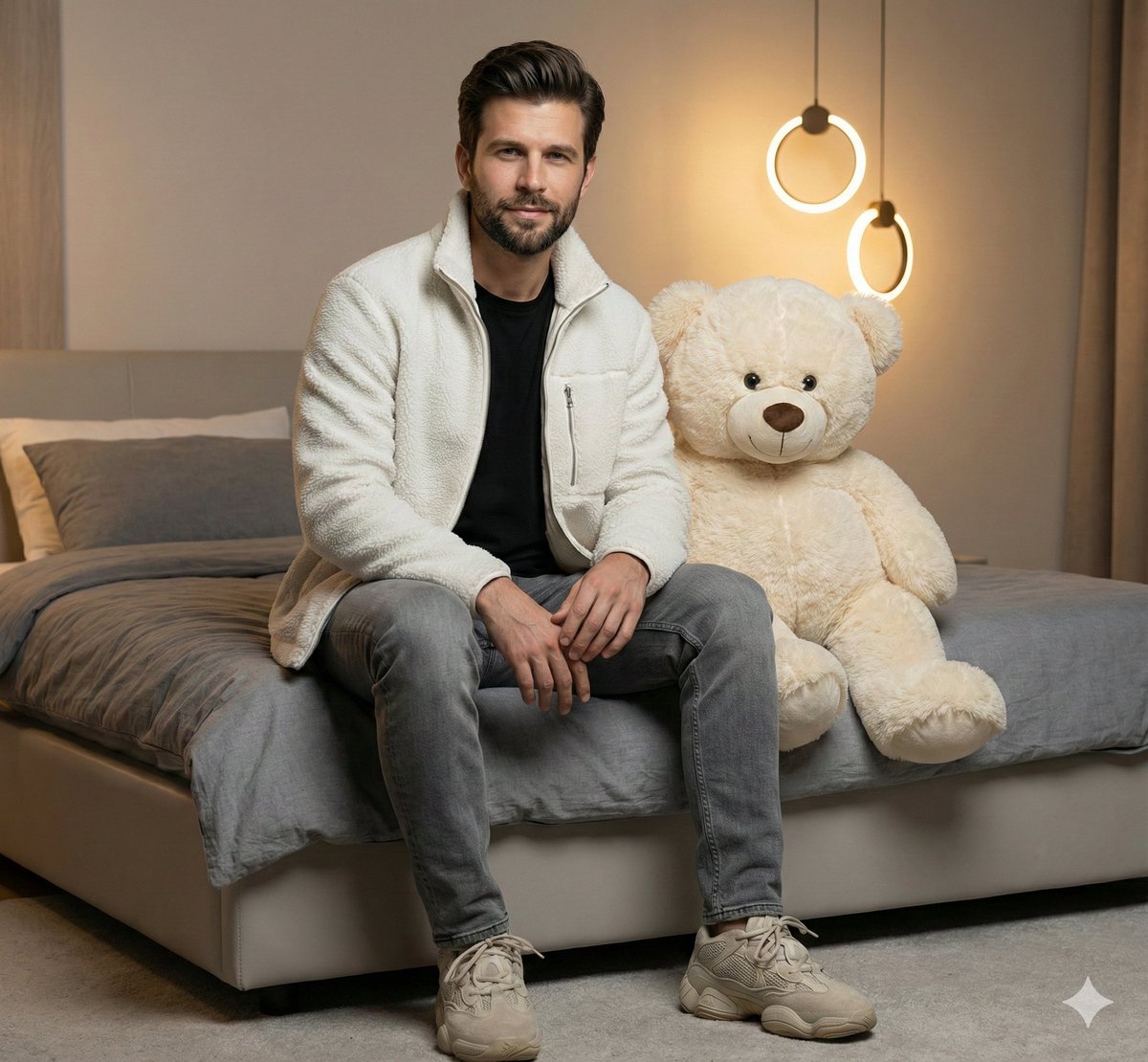 粉色影棚中怀抱巨型泰迪熊的时尚女郎