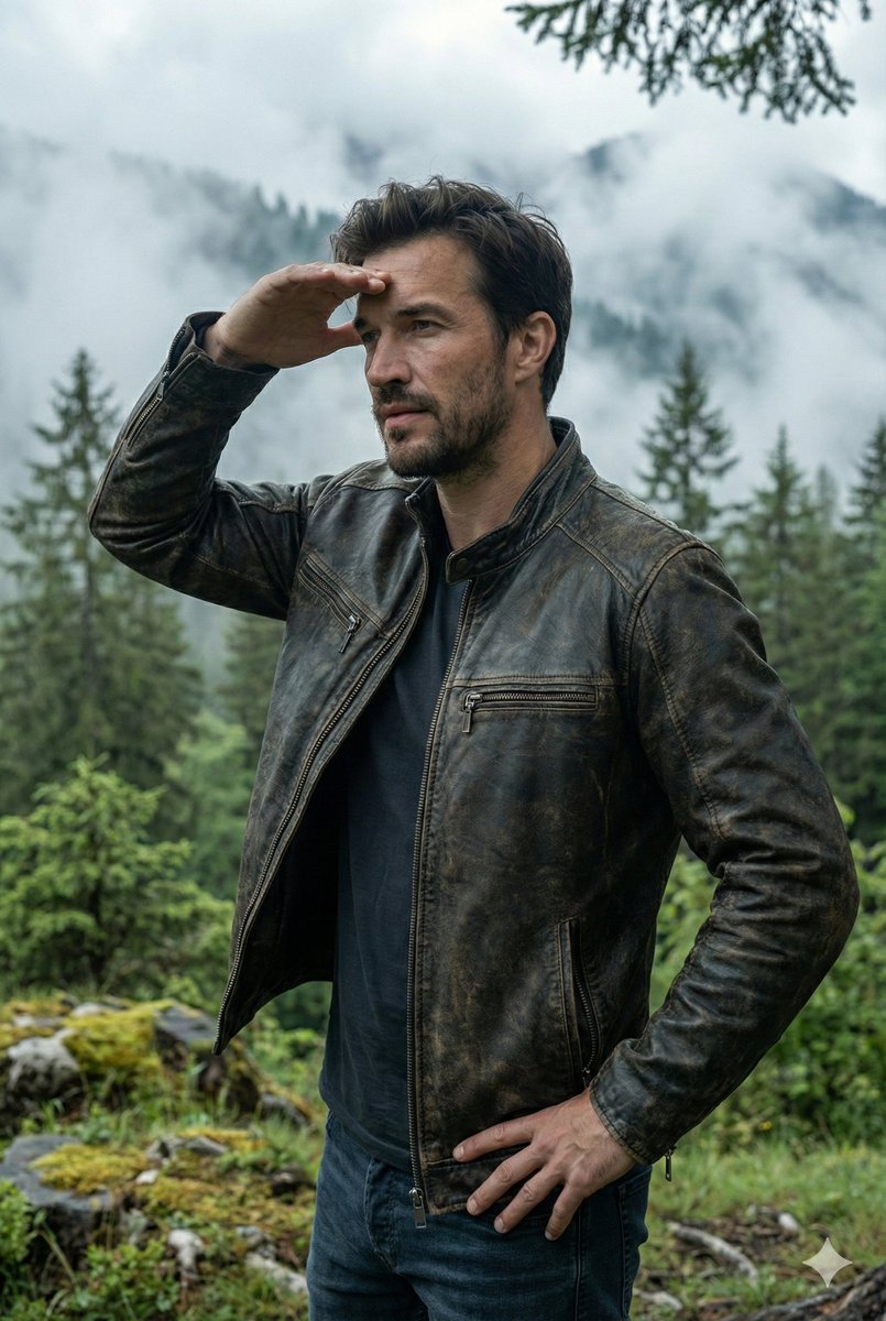迷雾荒野中身穿皮衣的硬汉探险家写真